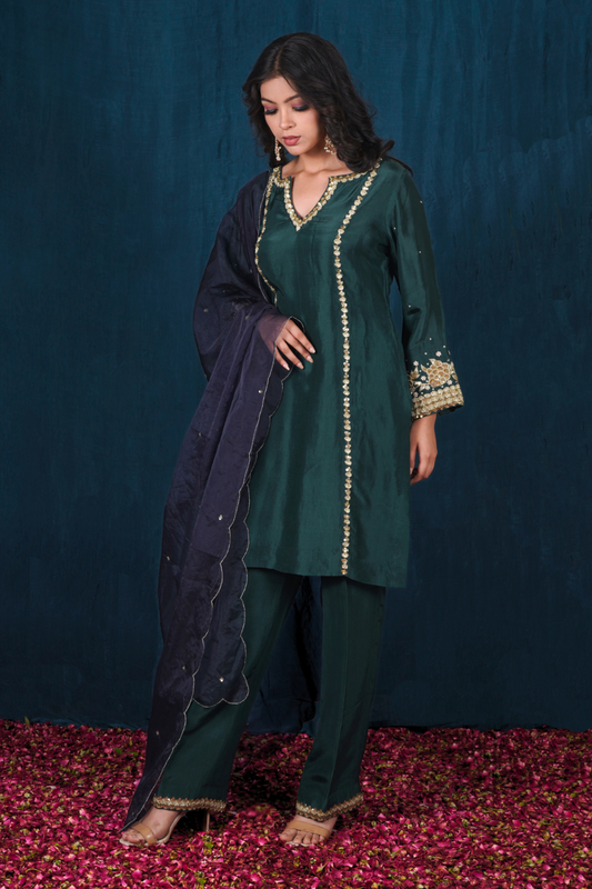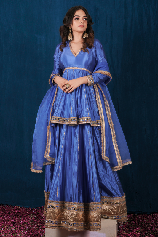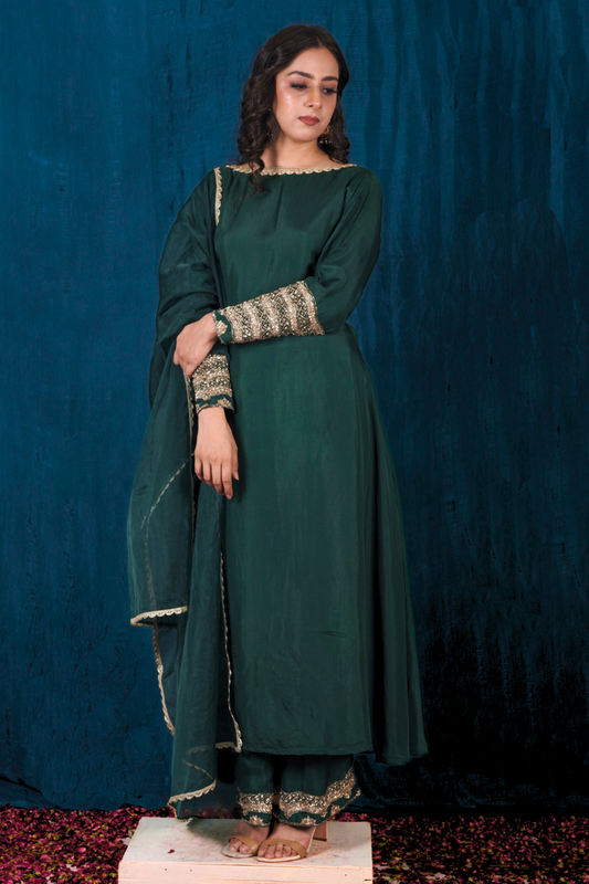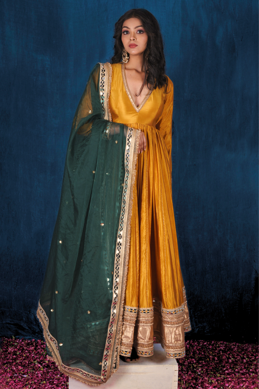 Green Front-Open Silk Anarkali Set with Blue Heavy Dupatta