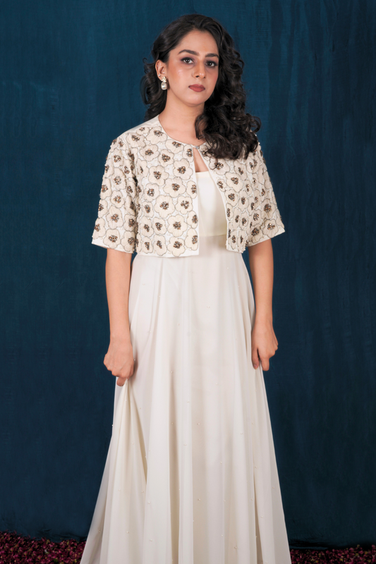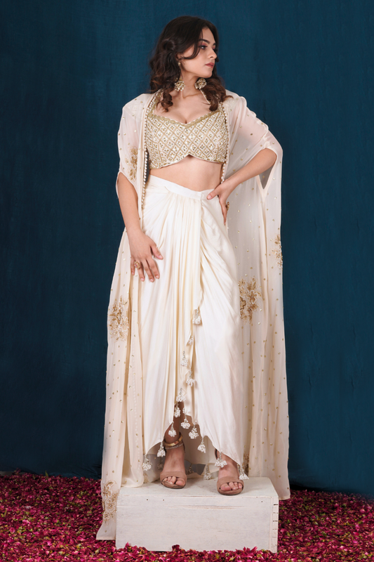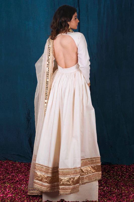 Off-White and Gold Banarasi Chanderi Anarkali Set with Skirt
