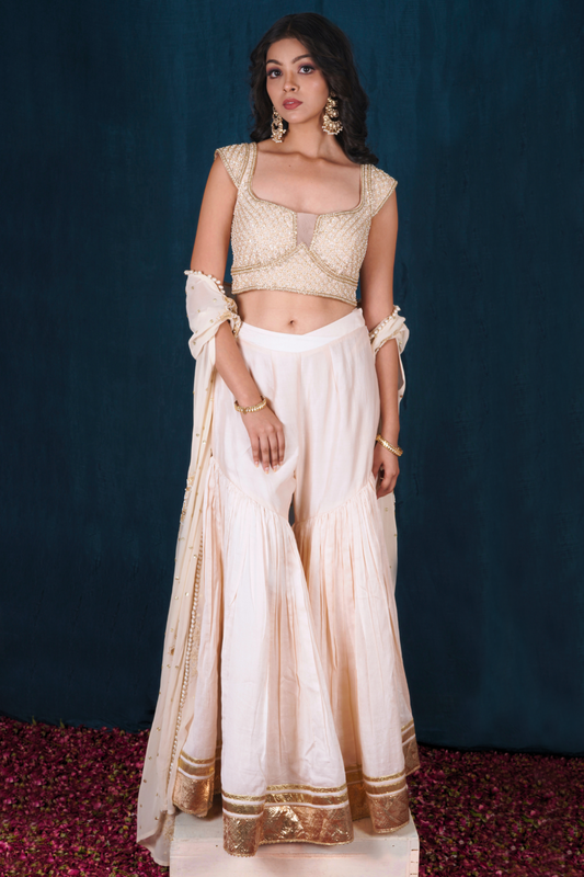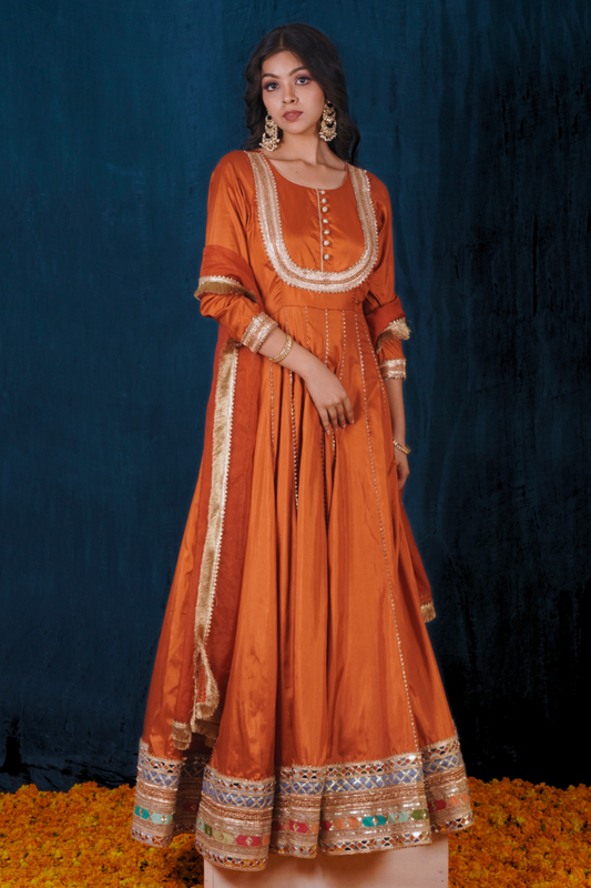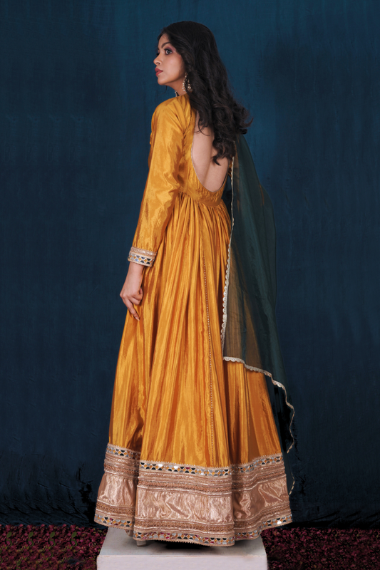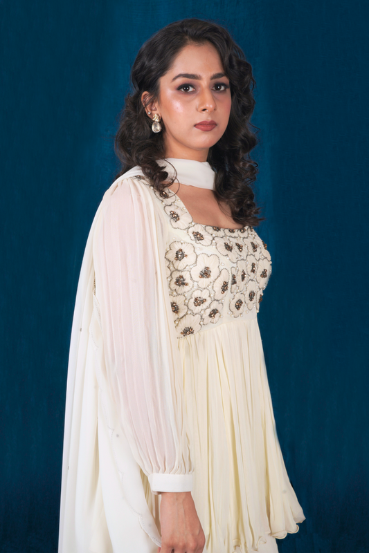 Off-White and Gold Opada Silk Anarkali Set with Heavy Dupatta
