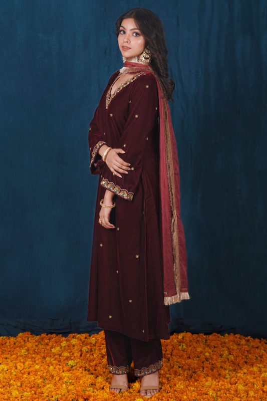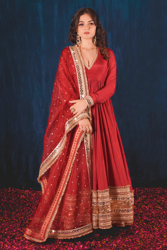 Red Opada Silk Anarkali Set with Red Heavy Dupatta i