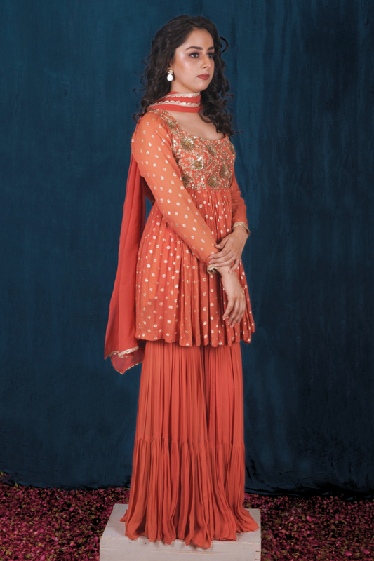 Rust Orange Banarasi Georgette Peplum and Sharara Set