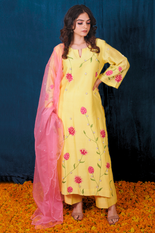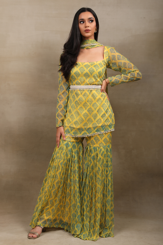 Hand Block Printed Yellow Chiffon Peplum Sharara Set